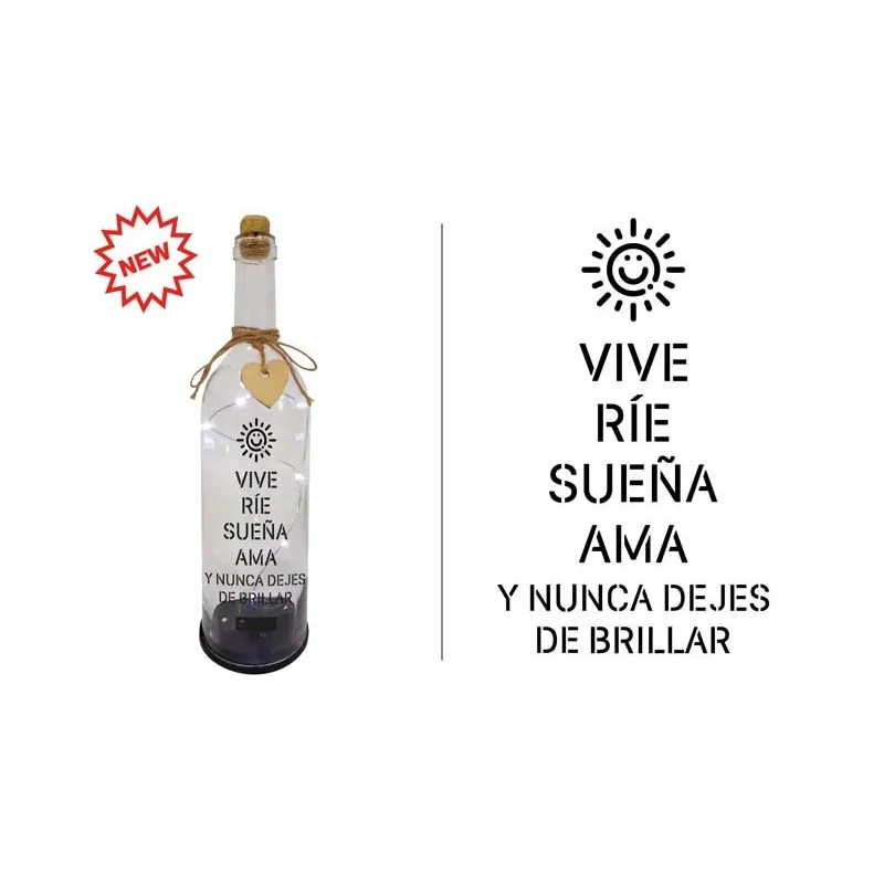 BOTELLA C/LUCES LED Y MENSAJE, VIVE,RIE SUEÑA...