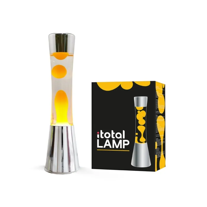 Lámpara de Lava Gravity con Base Plateada, Líquido Transparente y Cera Naranja
